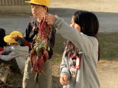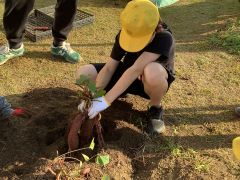 手でいものまわりの土を掘って、いもを傷つけないようにていねいに収穫しました。一人では抜けず3人がかりで引っ張る巨大なさつまいももありました。
