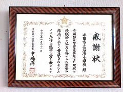 半田警察署より、交通安全指導で警察署と連携をしたり、保護者や地域の方が児童の登下校の様子を見守ったり、授業後に教職員が地域を巡回したりする活動などに対して感謝状をいただきました。今後も安全で安心して過ごせる学校づくりに努めます。
